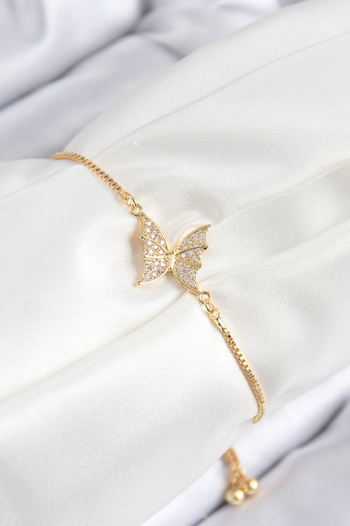 Pirinç Zirkon Taşlı Kelebek Model Gold Renk Asansörlü Kadın Bileklik BB7725