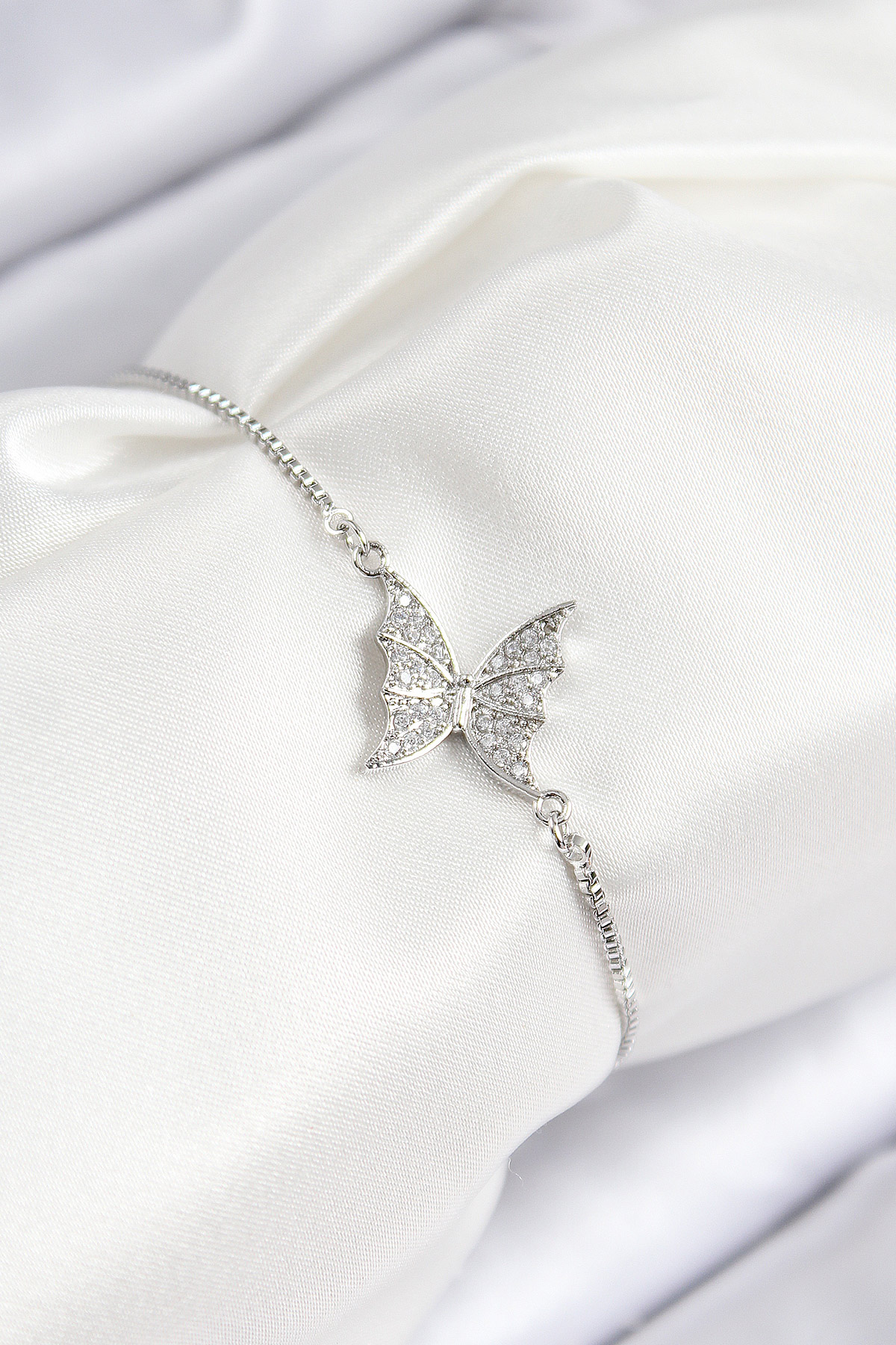 Pirinç Zirkon Taşlı Kelebek Model Gümüş Renk Asansörlü Kadın Bileklik BB7724