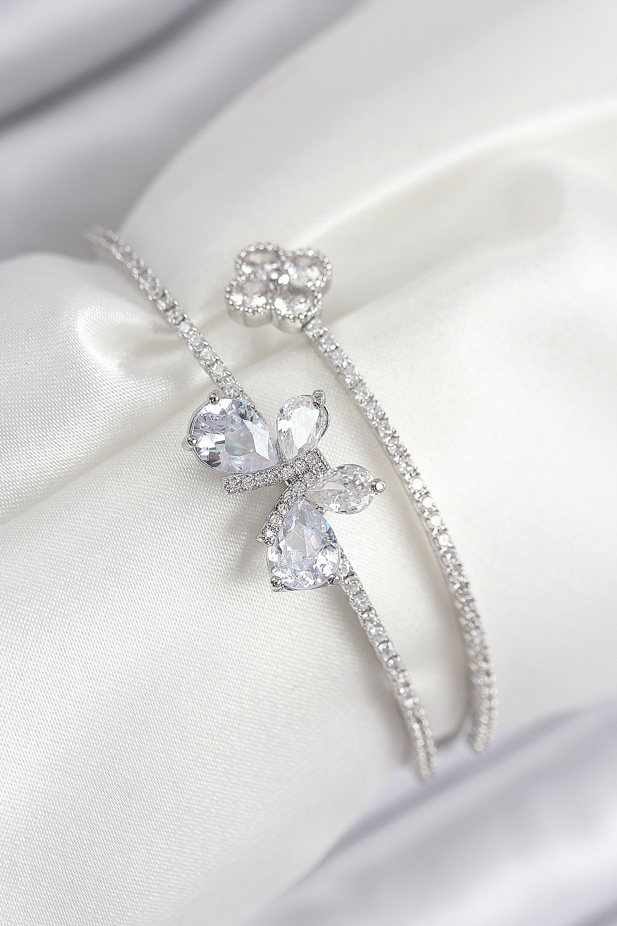 Pirinç Zirkon Taşlı Kelebek Ve Yonca Model Gümüş Renk Kadın Bileklik BB7850