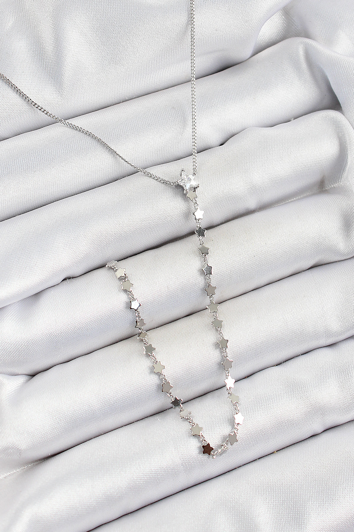 Pirinç Zirkon Taşlı Yıldız Figürlü Y Model Gümüş Renk Kadın Kolye BKO10309